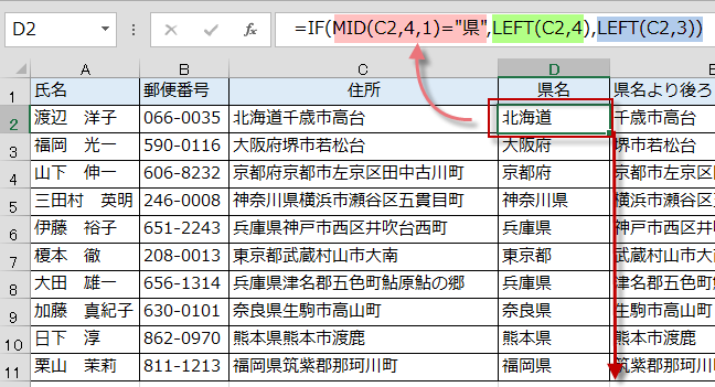 そこで、IF関数とMID関数を使って4文字目が県ならば、4文字取り出すという式にします。それ以外は、3文字取り出します。
