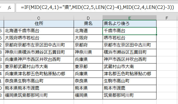 =IF(MID(C2,4,1)="県",MID(C2,5,LEN(C2)-4),MID(C2,4,LEN(C2)-3))