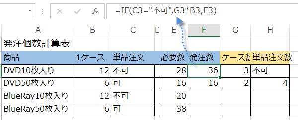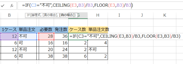 同様に、注文するケース数の場合もIF関数を使ってC3セルが不可の場合と可の場合に分けます。