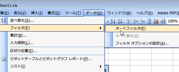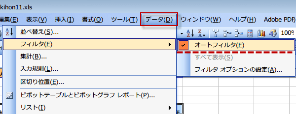 (2)「データ」→「フィルタ」→「オートフィルタ」を選択