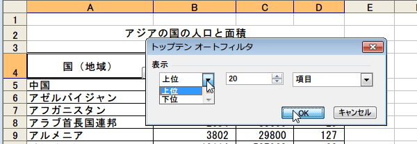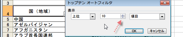 ここでは「トップ10」を抽出したいので、図のように指定し「OK」ボタンをクリックしました。