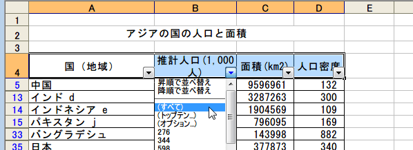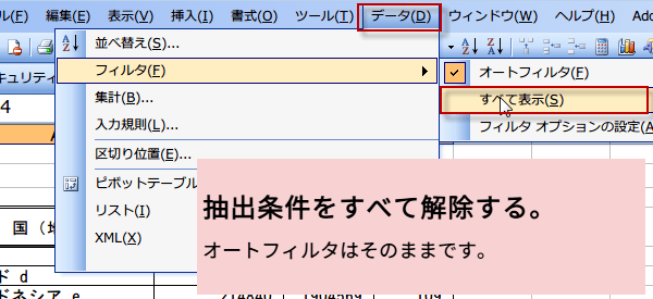 まとめてフィルダーをすべて解除するには、、[データ] メニューの [フィルタ] をポイントし、[すべて] をクリックします。設定した列のフィルタが解除されました。