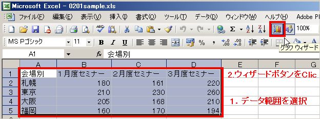 (2)データ範囲を選択後、ツールバーからグラフウィザードボタンをクリックします。