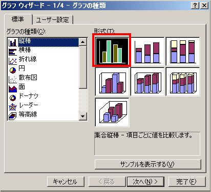 (4)ここでは簡単なグラフを作成します。標準のパネルから、グラフの種類(C)から縦棒のグラフを選択し、さらに形式(T)の中からシンプルな集合縦棒選択してみます。