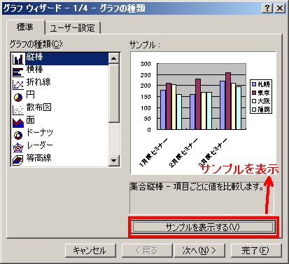 (5)選択したグラフの種類は、「サンプルを表示する(V)」ボタンをクリックし、マウスのボタンを押したままにしておくと、サンプルを確認することができます。