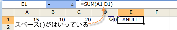 カンマ (,)をつかうところに、スペース( )がはいっている場合、#NULL!というエラーがでます。