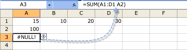 #NULL!は、指定した 2 つのセル範囲に共通部分がない場合に表示されます。