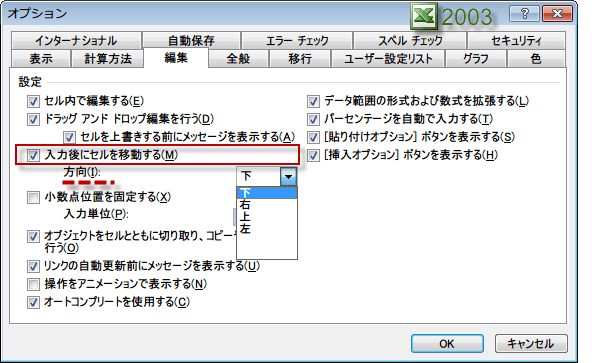 入力後にセルを移動するかどうか、あるいは方向は上下左右どの方向かという設定項目がオプションにあるのです。
