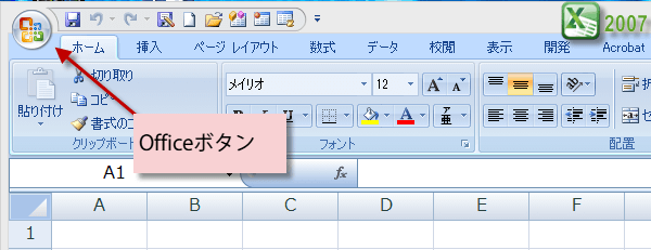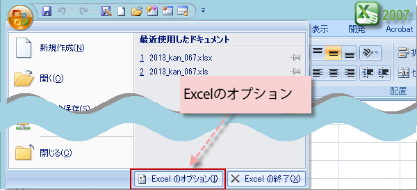 を表示するには、[Officeボタン]から[Excelのオプション]ボタンをクリックします。
