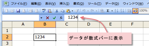 データを入力すると、アクティブセルのデータが、数式バーに表示されます。