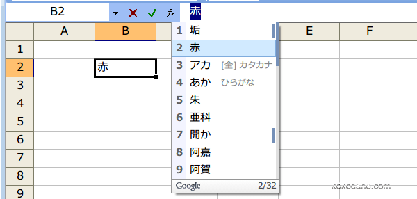 「あか」と入力して変換キーを押すと変換メニューが現れます。