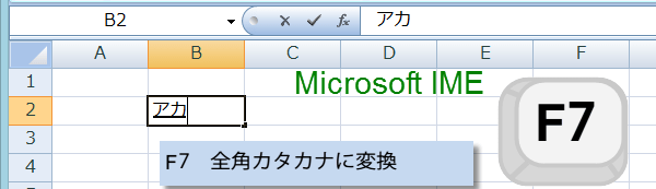 F7キーを押すと、全角カタカナに変換されます。