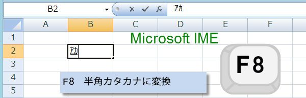 F8キーを押すと、半角カタカナに変換されます。