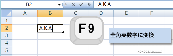 F9キーを押すと、全角英数字に変換されます。