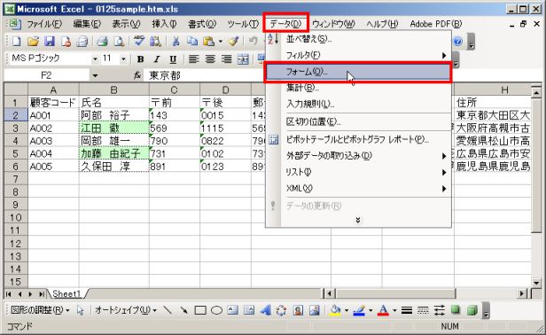 (1)表内の任意のセルをクリックし、メニューの「データ」→「フォーム」を選択します。