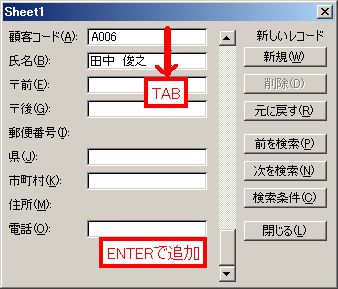 (2)新規の入力画面が表示されますので、それぞれの項目にデータを入力していきます。各項目の移動には「Tab」キーを使います。