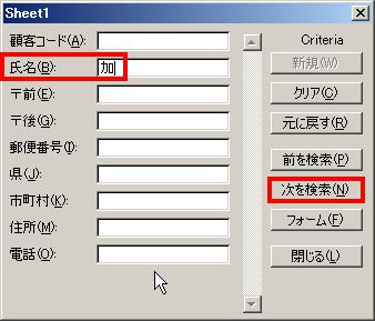 ※「次を検索」ボタンは、現在のセル(レコード)位置から下方向へ行いますので、そのセルより上にあるデータを検索対象にするときには、「前を検索」ボタンをクリックしてください。