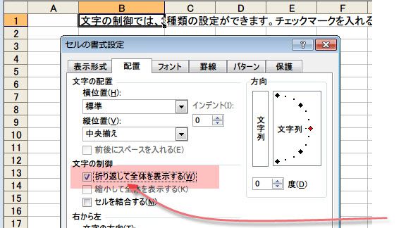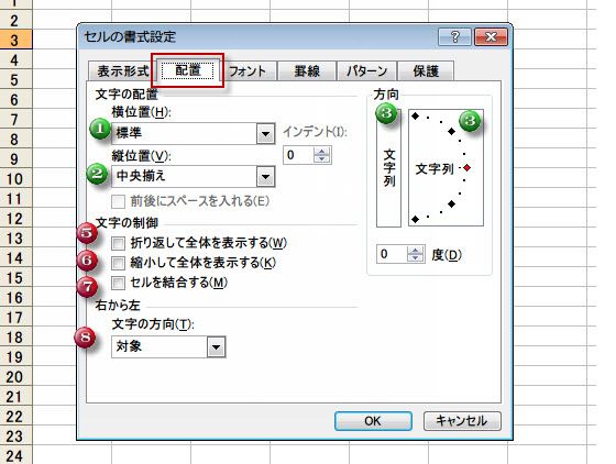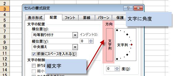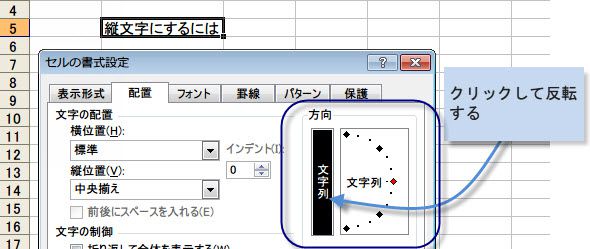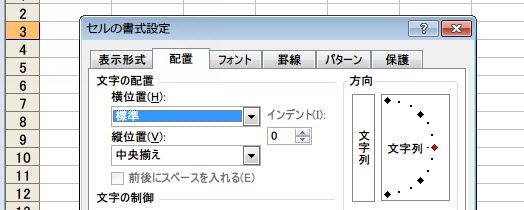 図のように、「配置」パネルを表示させると、セル内の文字の配置、方向、文字の制御が出来ます。