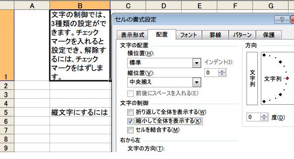 ・文字の配置では、セル内の文字を折り返したり、縮小したり、またセルを結合することもできる。