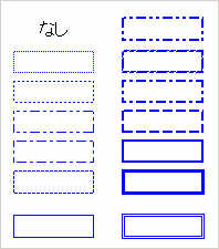 線の種類は、左図のようにいろいろあります。線種を選んで、プリセットの外枠と内側線をえらぶか、罫線を上下左右、間、斜めから指定して
