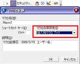 マクロの記録先を 「個人用マクロブック」にする事により、