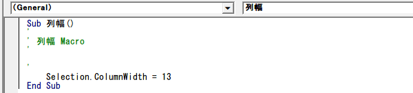 Selection.ColumnWidth = 13 で選択してあるものの列幅を13にするという意味になります。