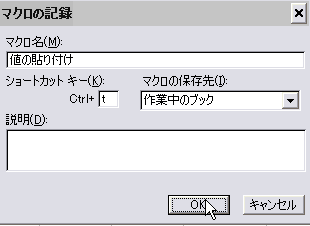 「値の貼り付けマクロ」など、内容が分かる名前にしましょう。
