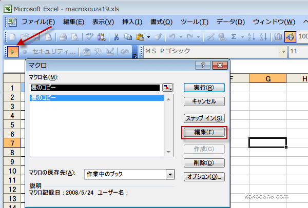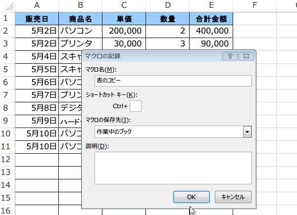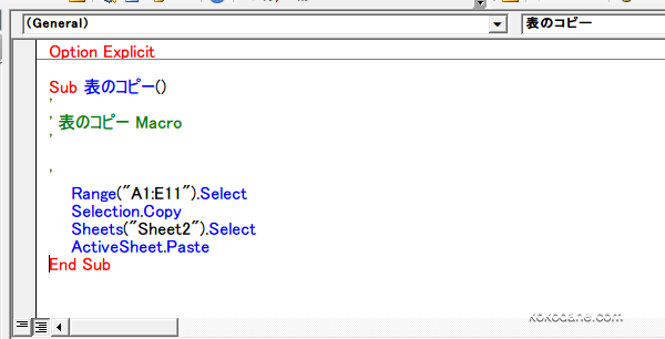 マクロ名は、「表のコピー」とかつけるといいですね。