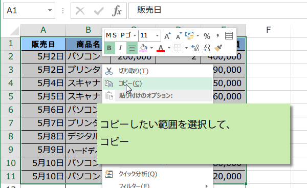 サンプルでは、A1からE11までを選択してコピーしてください。