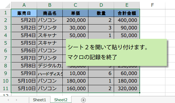 そしてSheet2を開いて、貼り付けます。マクロの記録を終了します。