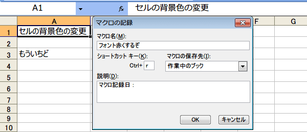 (3)「マクロの記録」の画面で、マクロ名に適当名前をつけてみましょう。