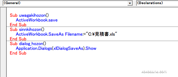 Sub sinnkihozon() ActiveWorkbook.SaveAs Filename:= _ "C:\見積書.xls", FileFormat:=xlNormal, _ Password:="", WriteResPassword:="", _ ReadOnlyRecommended:=False, _ CreateBackup:=False End Sub