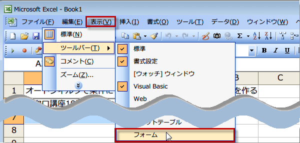 メニューの表示から、ツールバーを選択、 フォームをクリックします。