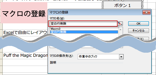 「空白行削除」を選択して、OKをクリックします。以上でボタン1が作成され、空白行を削除するマクロが登録されました。