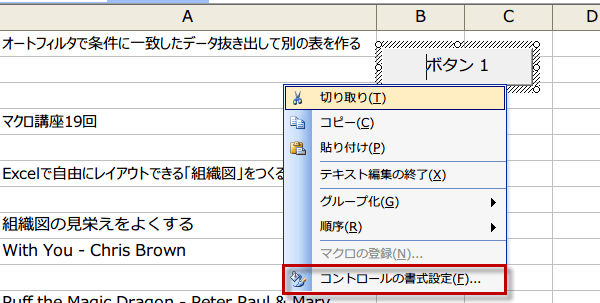 できあがったボタンが行の削除や挿入で移動したりしないようにしましょう。ボタンにカーソルを合わせて、選択状態にして、右クリックします。コントロールの書式設定をクリック。