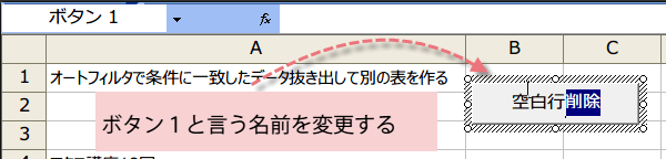 ここでボタン1という名前を変更して、空白行削除にしました。