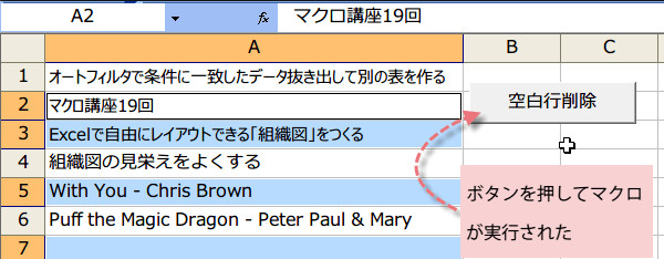 空白行削除ボタンをクリックすると、マクロが実行され空白行が削除されました。