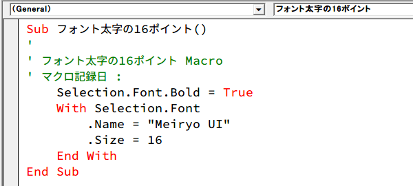 中を見ると、フォント太字の16ポイントという記録のマクロ(不要な部分は削除済み)が現れます。