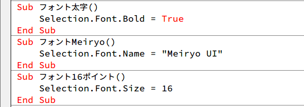 このマクロはフォントを太字にするというマクロとフォントをMeiryo UIにする、そして16ポイントにするという3つのマクロに分けることができます。