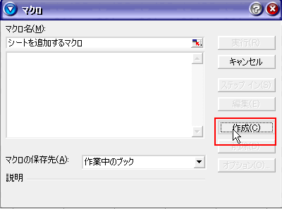 (4)マクロ名を、シートを追加するマクロにしましょう。