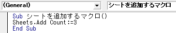 Sub シートを追加するマクロ() Sheets.Add Count:=3 End Sub