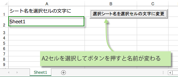 「選択シート名を選択セルの文字に変更」ボタンを押すとシート名が変わります。