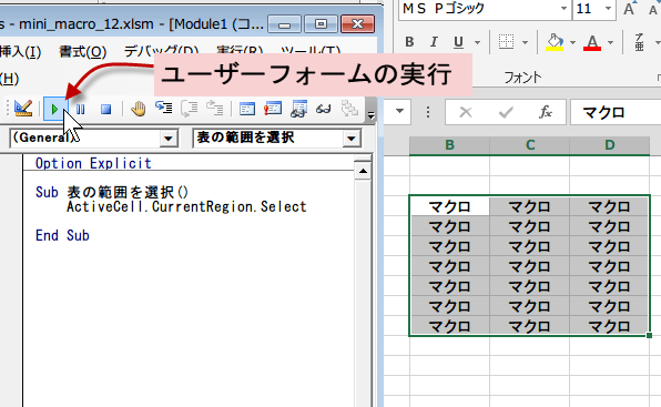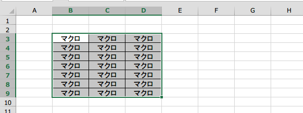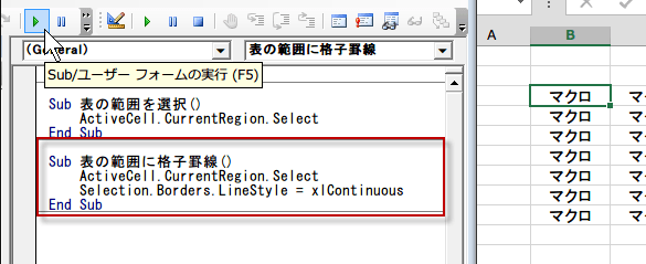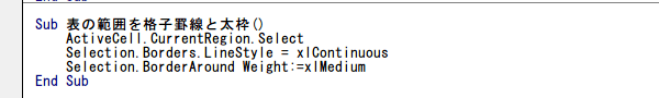 Excel VBA 3行マクロ〜表に格子罫線を引き外枠を太くするマクロ