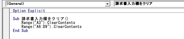 Excel VBA 3行マクロ〜14回 請求書などの入力欄だけクリアするマクロ