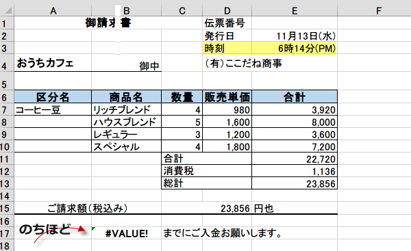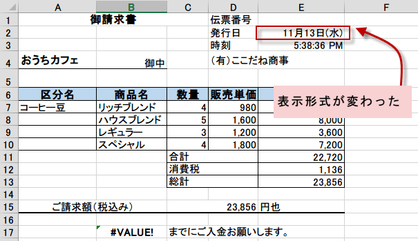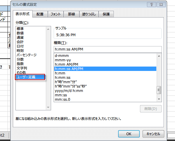 時間の表示も、変更してみます。書式はセルの書式設定ダイアログボックスのユーザー定義形式を指定する記号の書き方と同じです。