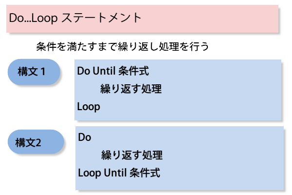 Do...Loop ステートメントは、条件を満たすまで、繰り返し処理を行うステートメントです。