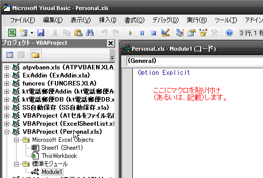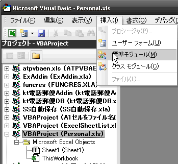 VBAProject(PERSONAL.XLS) を選択した状態で、VBEのメニューから挿入、