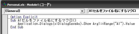 貼り付けたマクロは、A1セルをファイル名にするマクロです。