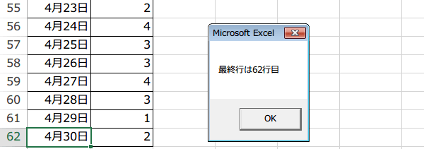 メッセージボックスで、最終行を教えるだけのマクロです。