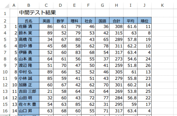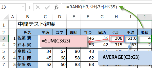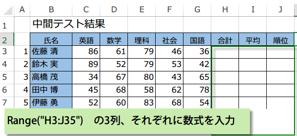 この表の3列に対して合計、平均、順位の数式を入力したいと思います。